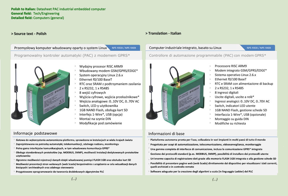 Tłumaczenie kart katalogowych kontrolerów gprs TECHBASE (PL > IT) |